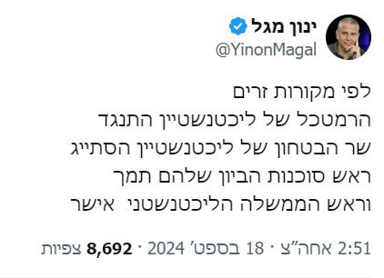 מתקפת הביפרים בלבנון. איש התקשורת ינון מגל העלה ציוץ בטוויטר לפיו שר הביטחון יואב גלנט והרמטכ"ל הרצי הלוי התנגדו לקיום המתקפה בלבנון אמש, אולם זאת יצאה לדרך לאחר תמיכתם של ראש הממשלה וראש המוסד.