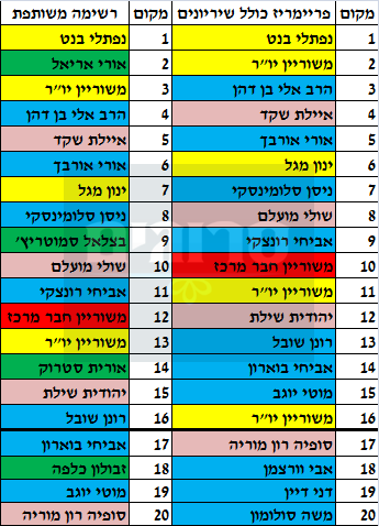 יהודית שילת היא האישה השלישית (מקדימה ב-26 קולות את סופיה רון מוריה) ונכנסת לשריון של הנשים בחמישי השלישית. רונן שובל, נמצא יחסית במקום נמוך עם 486 נקודות, אך יש לציין כי מדובר בסקר שרובו מקרב המגזר, כך שבשילוב מצביעים חילונים שהתפקדו בגל האחרון, הוא צפוי לקבל מקום גבוה יותר, ולהכנס לעשיריה הראשונה. וסוגר את המקומות הריאליים אביחי בוארון שמוצב כרגע במקום ה-14 ברשימת הבית היהודי וה-17 ברשימה המשותפת.
