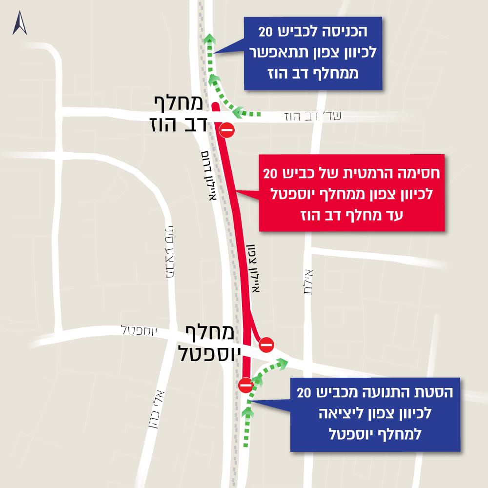 להלן הסדרי התנועה הזמניים שיתבצעו בשעות אלו: כביש איילון צפון (כביש 20) ייחסם הרמטית לנוסעים בכיוון צפון, בקטע שבין מחלף יוספטל למחלף דב הוז-  לא תתאפשר הכניסה לכביש איילון (כביש 20) לכיוון צפון ממחלף יוספטל- הכניסה לכביש איילון (כביש 20) לכיוון צפון ממחלף דב הוז תתאפשר כרגיל