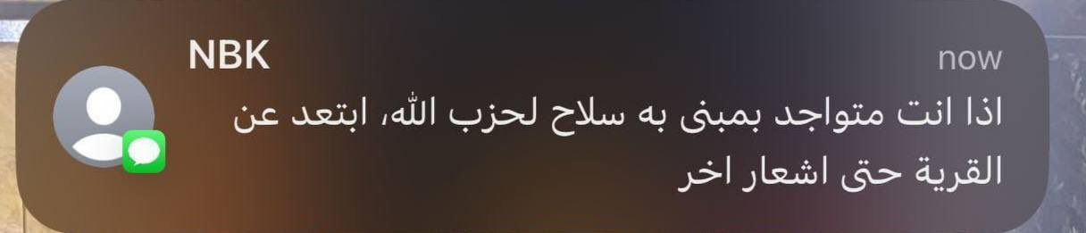 "אם אתה נמצא במבנה שיש בו אמצעי לחימה של חיזבאללה, התרחק ממנו עד להודעה חדשה", נכתב בהודעת סמס שנשלחה לעשרות אלפי לבנונים, בדרום לבנון אך גם צפונה משם.