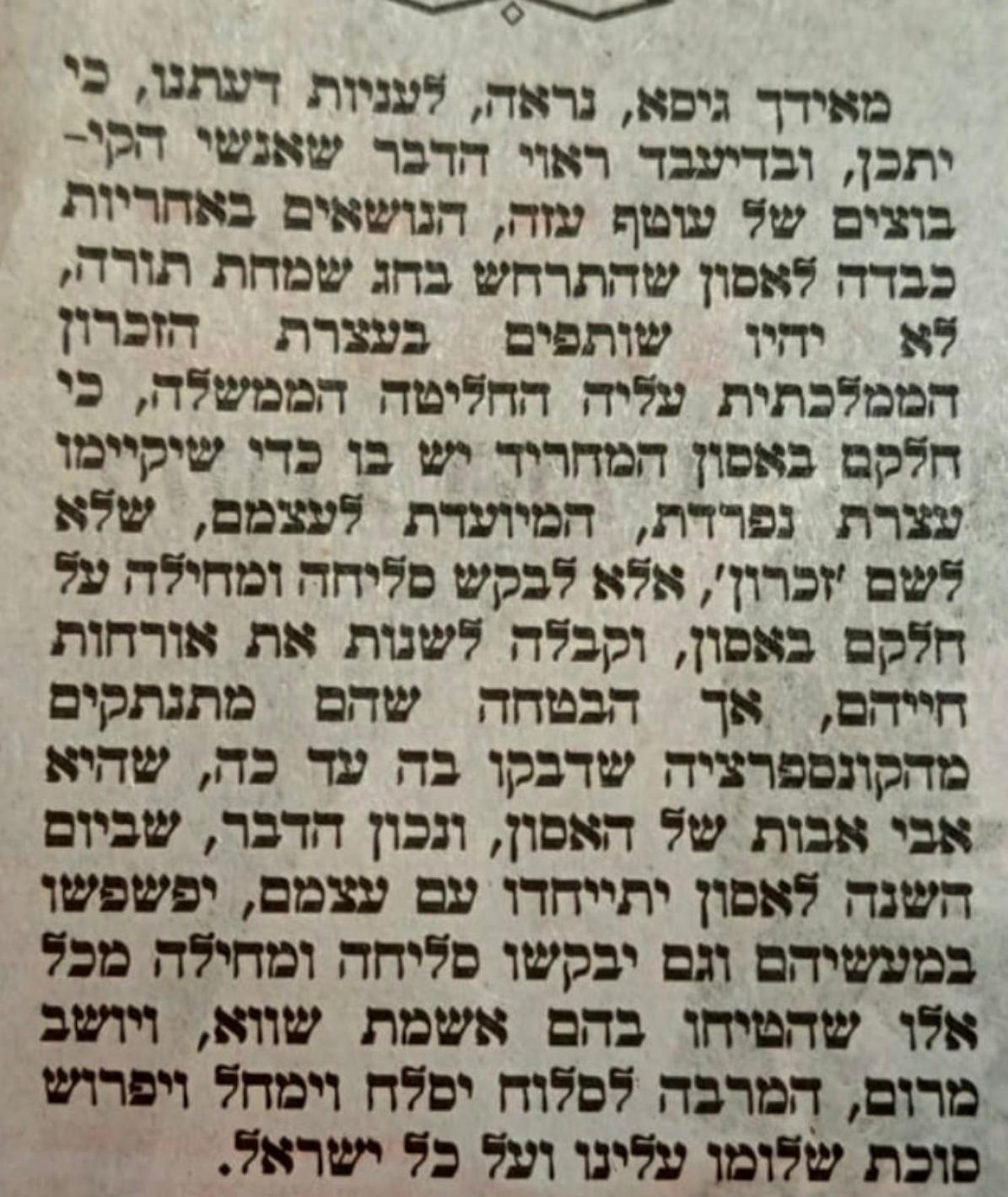 "ראוי הדבר שאנשי הקיבוצים של עוטף עזה, הנושאים באחריות כבדה לאסון שהתרחש בחג שמחת תורה, לא יהיו שותפים בעצרת הזיכרון הממלכתית שעליה החליטה הממשלה – כי חלקם באסון המחריד יש בו כדי שייקמו עצרת נפרדת, המיועדת לעצמם, שלא לשם 'זיכרון', אלא כדי לבקש סליחה ומחילה על חלקם באסון וקבלה לשנות את אורחות חייהם".