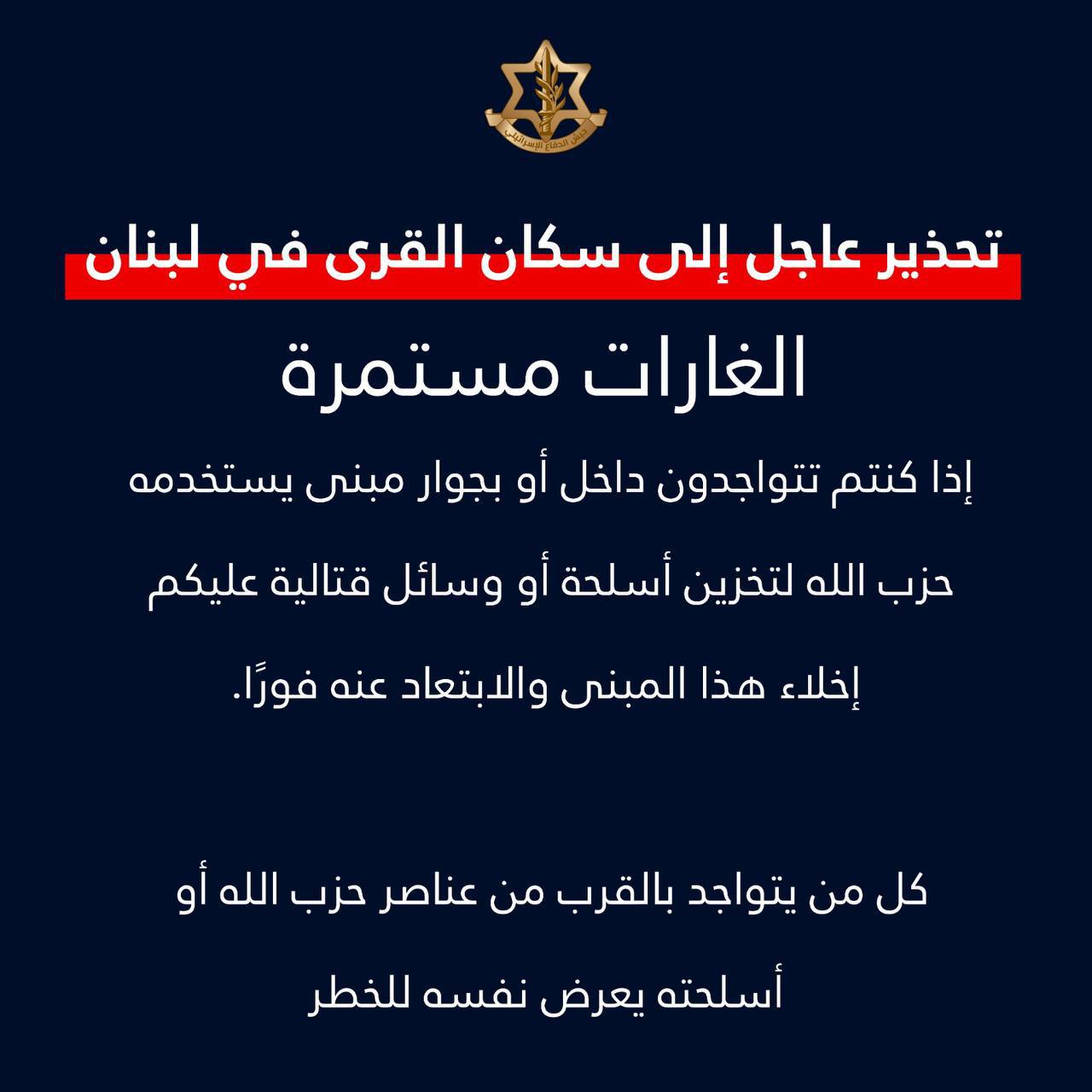בהודעה שפורסמה נכתב: "לכל תושבי הכפרים הלבנוניים שפינו את בתיהם לביטחונם עקב הימצאות נשק או גורמים של הטרור חיזבאללה. פשיטות צה"ל נמשכות למען ביטחונך, אל תחזור לבתיך עד להודעה חדשה".