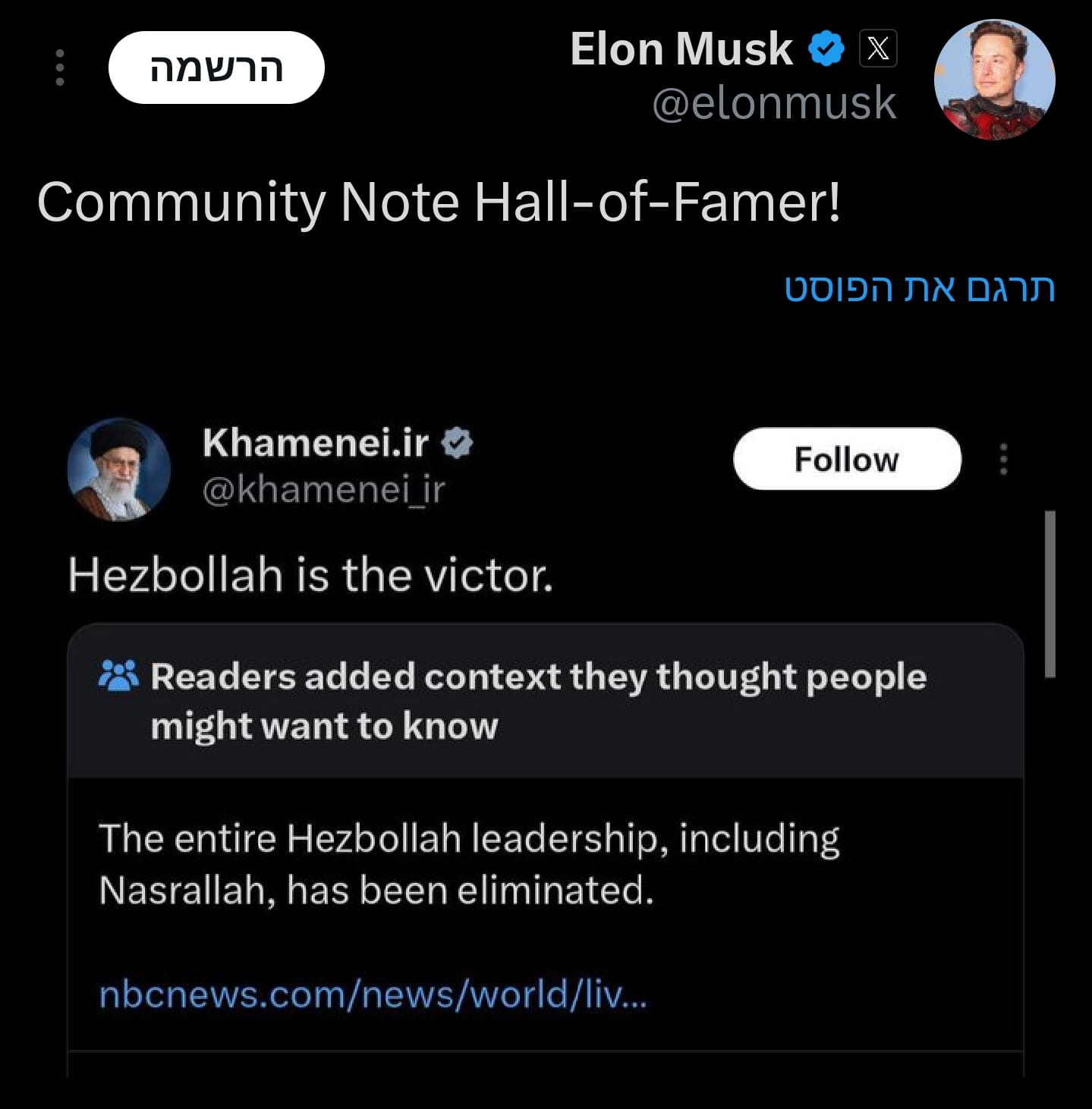 בפוסט שיתף מאסק פוסט של המנהיג העליון של איראן האייתולה חמינאי מלפני יום, בו כתב מנהיג איראן: "חיזבאללה הוא המנצח", כאשר מתחת לפוסט של חמינאי הוספה הערה עם הבהרה בה נכתב על ידי צוות רשת X: "כלל ההנהגה של חיזבאללה, כולל מנהיגה נסראללה חוסלו".