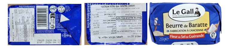 שם המוצר: חמאה מלוחה עם מלח אטלנטי. גודל אריזה: 250 גרם. תאריך תפוגה: 12/04/2026. תאריך ייצור: 12/04/2024. ברקוד: 3252920013494.