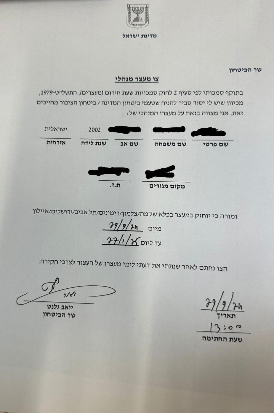 שר הביטחון גלנט חתם לפני זמן קצר על צו מעצר מנהלי לארבעה חודשים נגד שני תושבי השומרון, אחד מהם נשוי ואב לילדה קטנה, לאחר שנעצרו בסוף השבוע ע"י ימ"ר ש"י. הצו ניתן למתיישבים דקות לפני דיון בבית המשפט בו היו צפויים להשתחרר ממעצר.