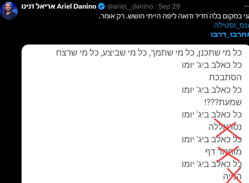 ההודעה הרשמית של דובר צה"ל על חיסולו של מזכ"ל חיזבאללה חסן נסראללה, אפשרה בשבוע החולף לסמן וי ענק על שם נוסף בשיר, לצידם של מוחמד דף ואיסמעיל הניה.