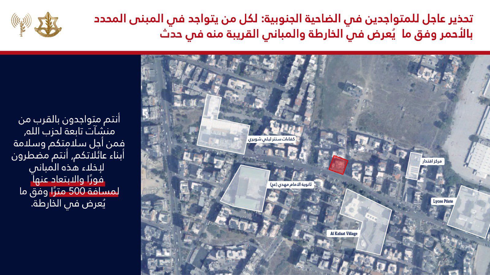 בהודעה שפרסם נכתב: "אזהרה דחופה לתושבי הפרבר הדרומי בורג' אל-בראג'נה במיוחד במבנים המפורטים במפות ובאלה הסמוכים להם. אתם נמצאים ליד מתקנים ואינטרסים של חיזבאללה, וצה"ל יפעל נגדם בעתיד הקרוב."