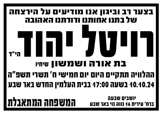 רויטל יהוד ז"ל תובא למנוחות היום בשעה 17:00 בבית העלמין החדש בבאר שבע. משפחתה תשב שבעה בביתה ברחוב עירית 16 שבשכונת נווה נוי בבאר שבע.