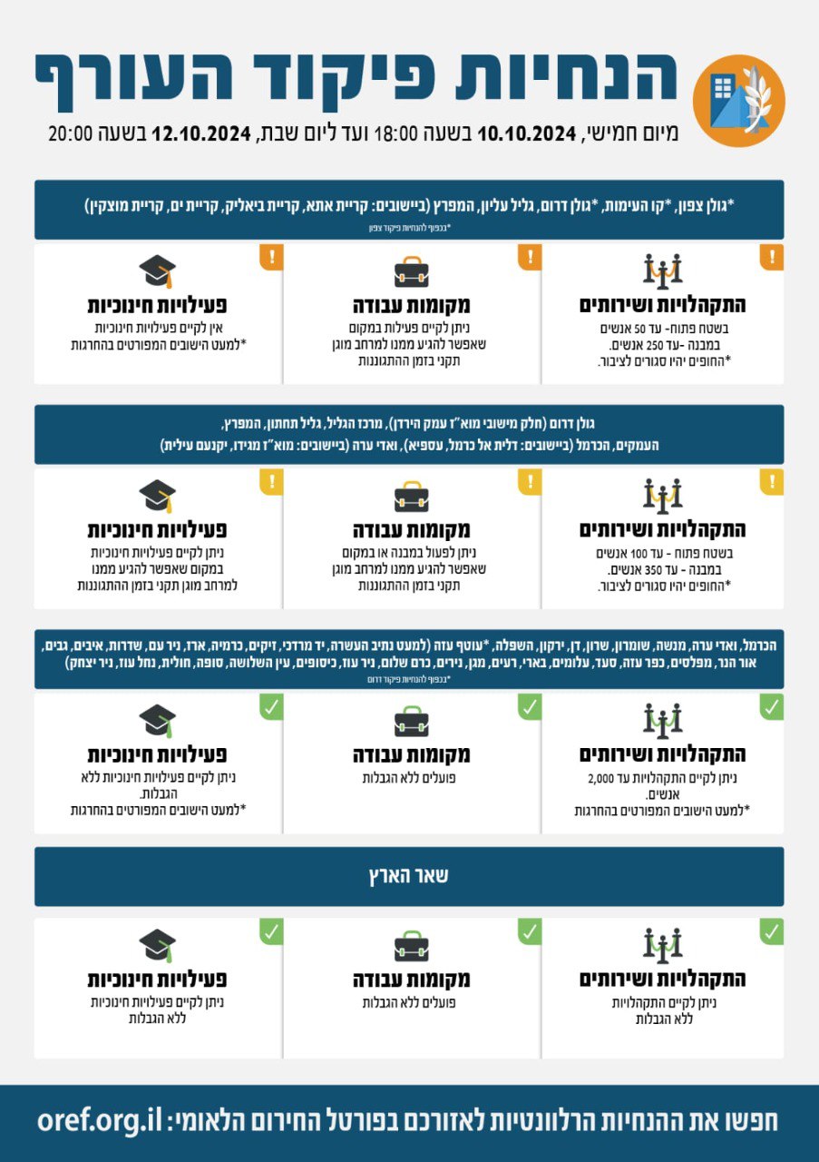 שאר אזורי הארץ נותרו ללא שינוי בהנחיות שניתנו עד כה.