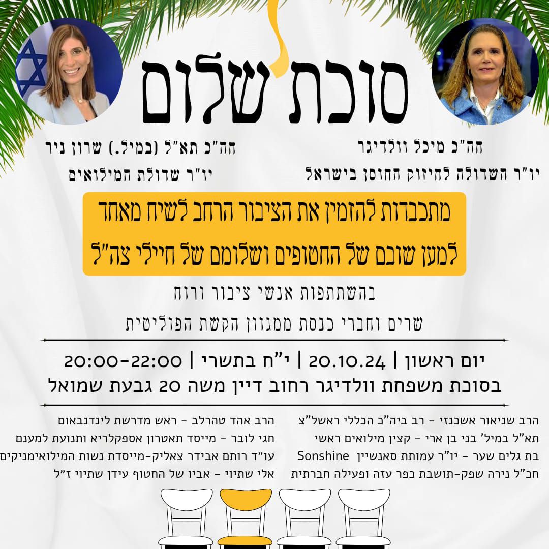 לדבריה: "בימים אלה, כשהלב נקרע לנוכח הכאב על הנופלים והדאגה לשלומם של החטופים ושלומם של חיילינו הגיבורים, אנחנו מוצאים משמעות עמוקה בלשבת יחד בסוכה, בצל השכינה, במקום שמזכיר לנו את ההגנה השמימית, להדגיש יחד את המאחד ולא את המפריד ולבקש שלום בינינו למען שובם הביתה של החטופים, העקורים והחיילים, בשלום ובלי כל פגע".