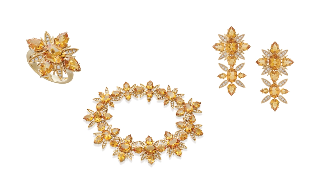 אבני סיטרין בצבעי כתום וצהוב מרהיבים המשקפים את חום השמש ופריחת הטבע, בשילוב זהב צהוב המעניק נוכחות ואנרגיה זוהרת לכל תכשיט.