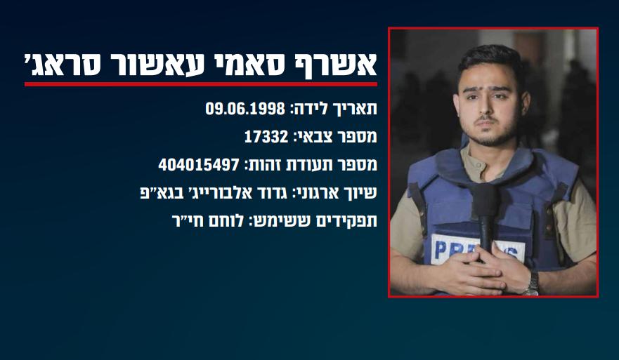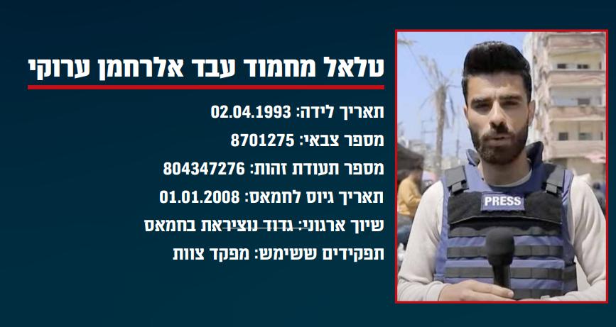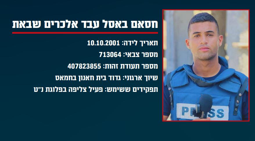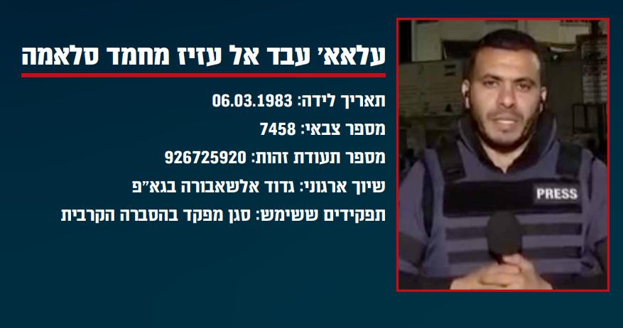 צה"ל חושף מידע מודיעני ומסמכים רבים שנמצאו ברצועת עזה המאשרים את השתייכותם הצבאית לארגוני הטרור חמאס וגא״פ של שישה עיתונאי רשת אלג'זירה בעזה – אנס אלשריף, עלאא' סלאמה, חסאם שבאת, אשרף אלסראג', איסמאעיל אבו עמר וטלאל אלערוקי.