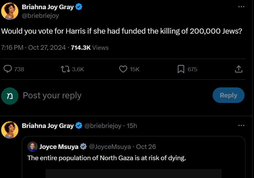 בציוץ שפרסמה הלילה (שני) בחשבון הטוויטר שלה, הבהירה גריי כי אינה הולכת להצביע לקמלה האריס, בשל תמיכת ממשל ביידן בישראל, וכתבה: "האם היית מצביע להאריס אם היא הייתה מממנת הרג של 200,000 יהודים?".