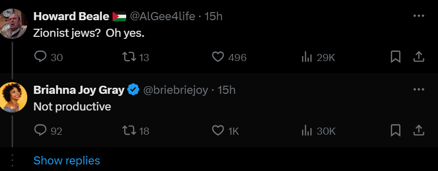 הפרשנית הפוליטית בריאנה ג'וי גריי, מסעירה את הרשת שוב לאחר שהגיבה לגולש שטען כי היה מממן רצח של יהודים ציוניים – "לא פרודוקטיבי".