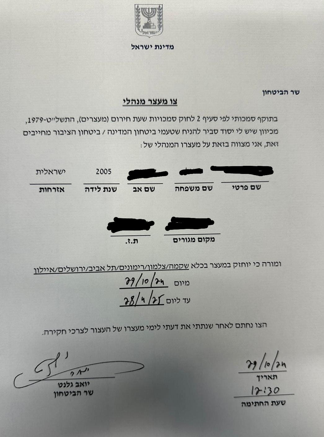 מתיישב בן 19 תושב בנימין הושלך למעצר מנהלי למשך חצי שנה בצו עליו חתם שר הביטחון גלנט. עו"ד דניאל שימשילשווילי מארגון חוננו המייצג את המתיישב: "טובי בניה של ההתיישבות נופלים בקרב וגלנט שולח את אחיהם למעצר מנהלי".