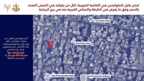 בהודעה נאמר: "לכל התושבים הנמצאים באזור הפרבר הדרומי, במיוחד במבנים המפורטים במפות המצורפות ובמבנים הסמוכים להם באזורים חארת חריכ ובורג' אל-בראג'נה. אתם נמצאים ליד מתקנים ואינטרסים של חיזבאללה, שצה"ל יפעל נגדם בכוח בעתיד הקרוב".