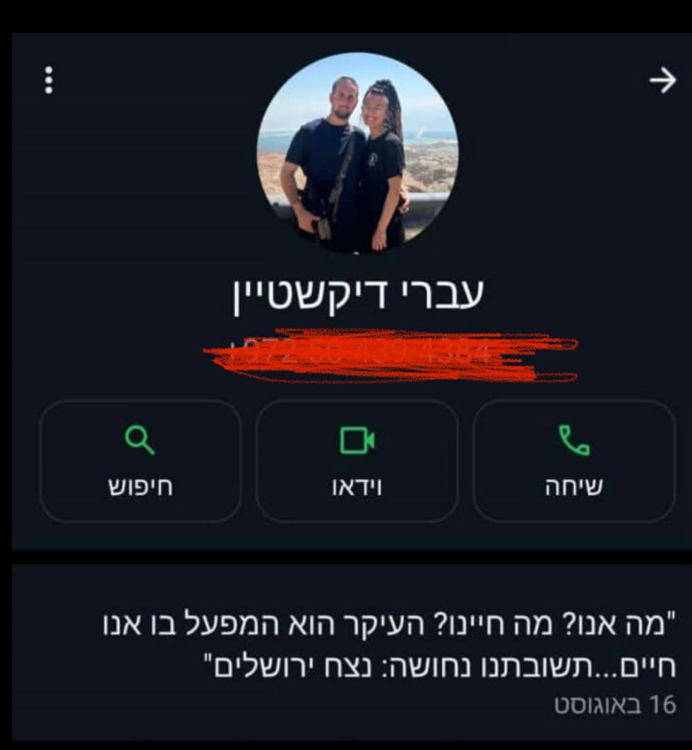 לפעמים הפרופיל בוואטסאפ, נותן במשפט אחד הצצה לעולמו של המחזיק ביישומון. סגן עברי דיקשטיין הלוחם שנפל היום (ה') בדרום לבנון כתב בססטוס שלו את המוטו שלו לחיים, את המטרה ואת השאיפה אליה הוא מכוון.