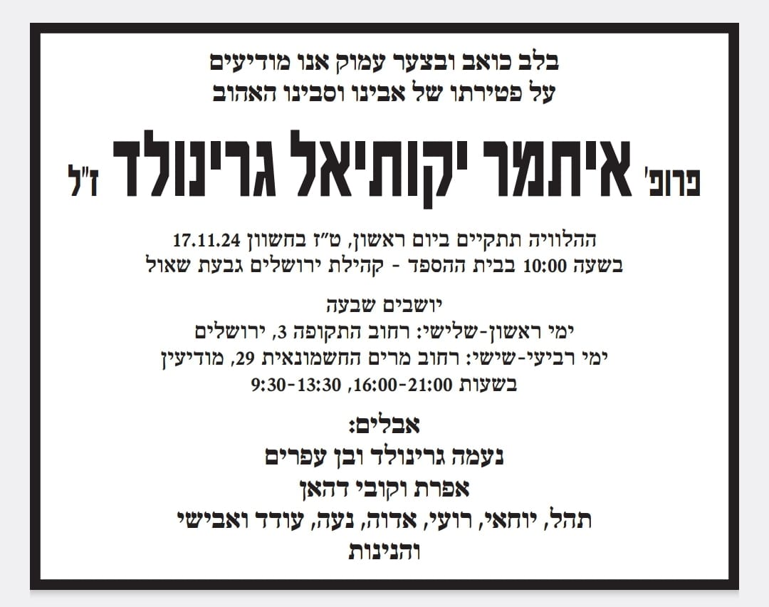 ברוך דיין האמת. בגיל 87 הלך לעולמו פרופ' איתמר גרינולד, חוקר מחשבת ישראל, מרצה ומחבר ספרי מחשבה, תושב שכונת קטמון בירושלים.
