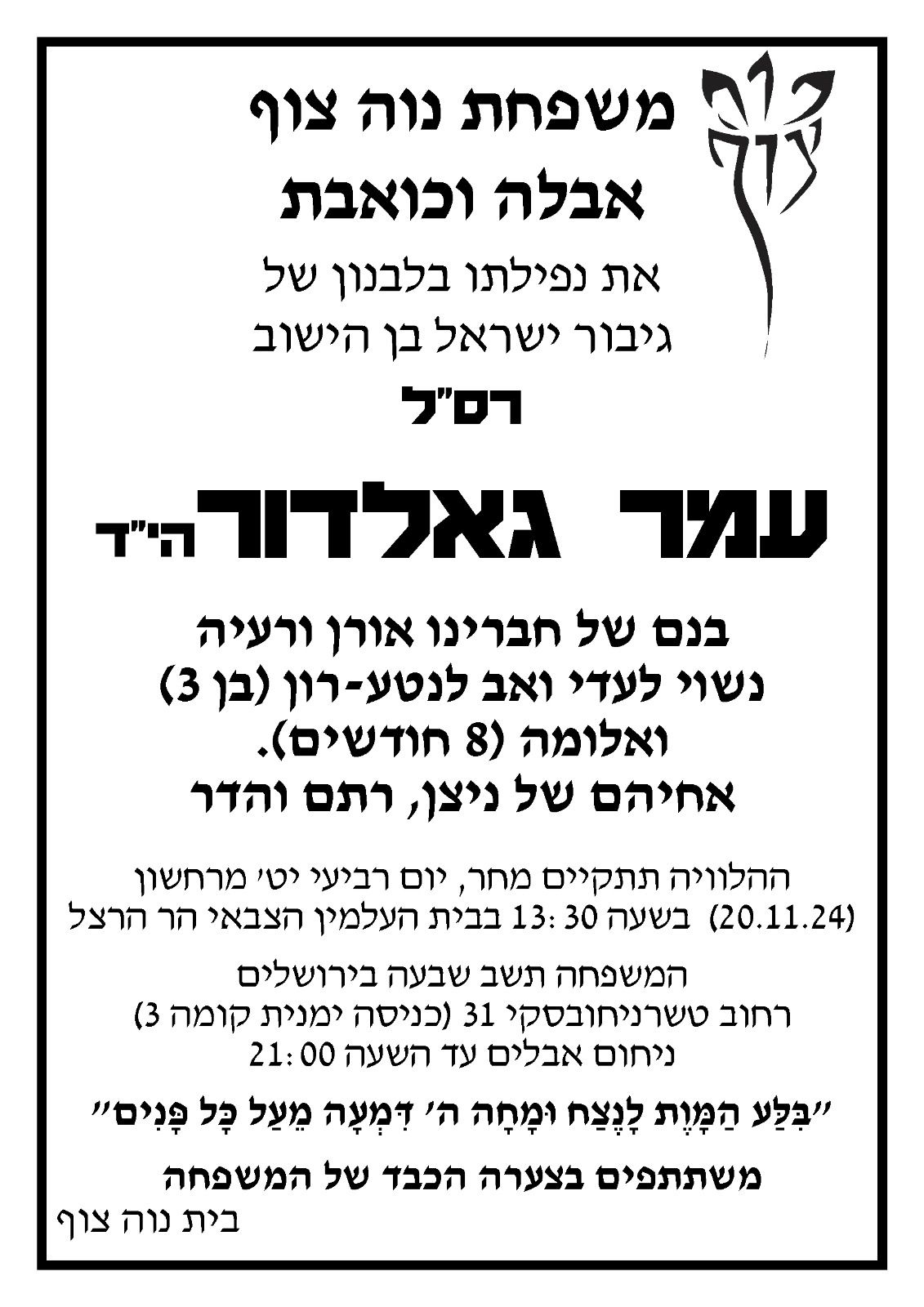 ביישוב נווה צוף ספדו הערב (שלישי) ללוחם המילואים עמר גאלדור זכרונו לברכה, שנפל מוקדם יותר היום באירוע הקשה בלבנון. ביישוב סיפרו: "עמר הוא בנם של רעיה ואורן מוותיקי הישוב. משפחה שורשית, מלח הארץ. עמר נשוי לעדי ואב לנטע-רון (בן 3) ואלומה (8 חודשים). ואחיהם של רתם, ניצן והדר. הדר אחיו, התחתן רק לפני כשבועיים ונמצא בדרכו חזרה ארצה מחו"ל".