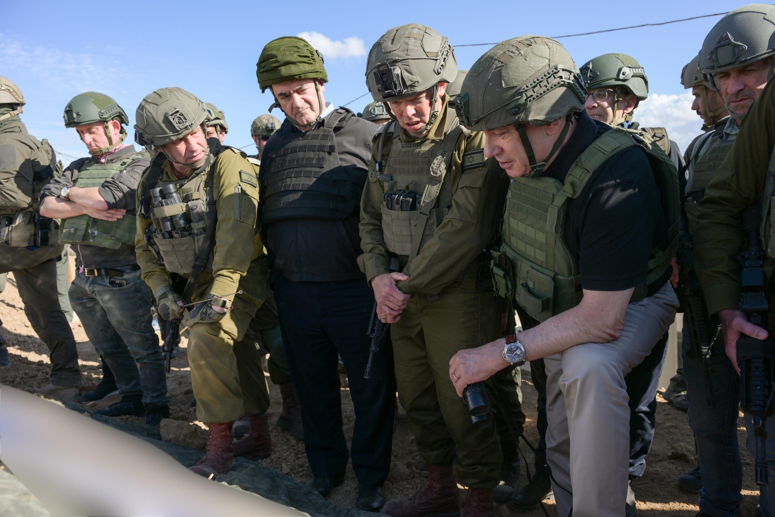 ראש הממשלה בנימין נתניהו ושר הביטחון ישראל כ"ץ, יחד עם הרמטכ"ל רב אלוף הרצי הלוי וראש השב"כ רונן בר ביקרו היום (שלישי) במסדרון נצרים שבעזה. נתניהו והשר כ"ץ קיבלו סקירה אזורית ממאו"ג 99 יואב ברונר ואלוף פיקוד דרום ירון פינקלמן מאחת מנקודת התצפית שבמרחב המסדרון.
