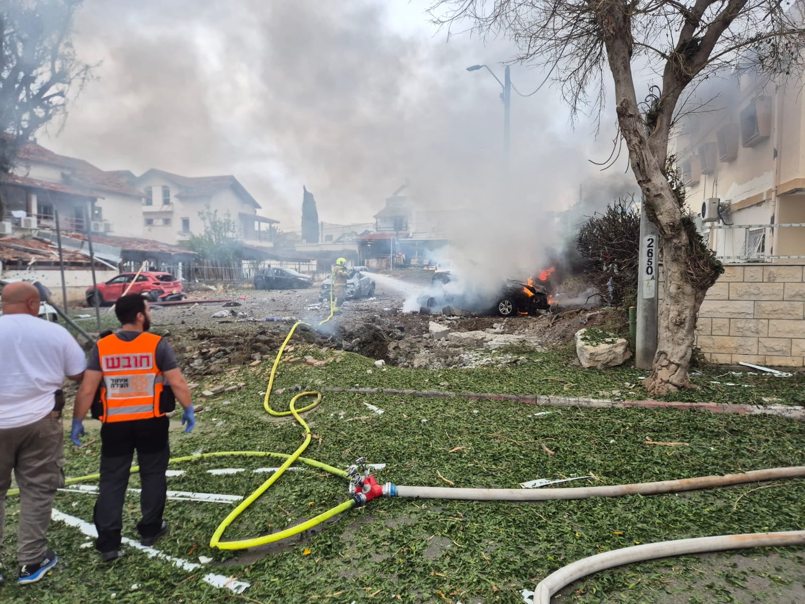 סגן מנהל מרחב ירקון במד"א שחר חזקלביץ ופראמדיק מד"א יהודה שושנה סיפרו כי "הגענו למקום בכוחות גדולים וראינו הרס רב ומספר רכבים שעולים באש. התחלנו בסריקות של הבתים וברחובות סמוכים, ראינו אישה כבת 70 כשהיא בהכרה מלאה וסובלת משאיפת עשן כתוצאה מרכב שעלה באש. צעיר בן 23 נפצע באורח קל מהדף. בנוסף צוותי מד"א מעניקים טיפול רפואי למספר נפגעי חרדה ואנשים שנחבלו בדרך למרחב מוגן".