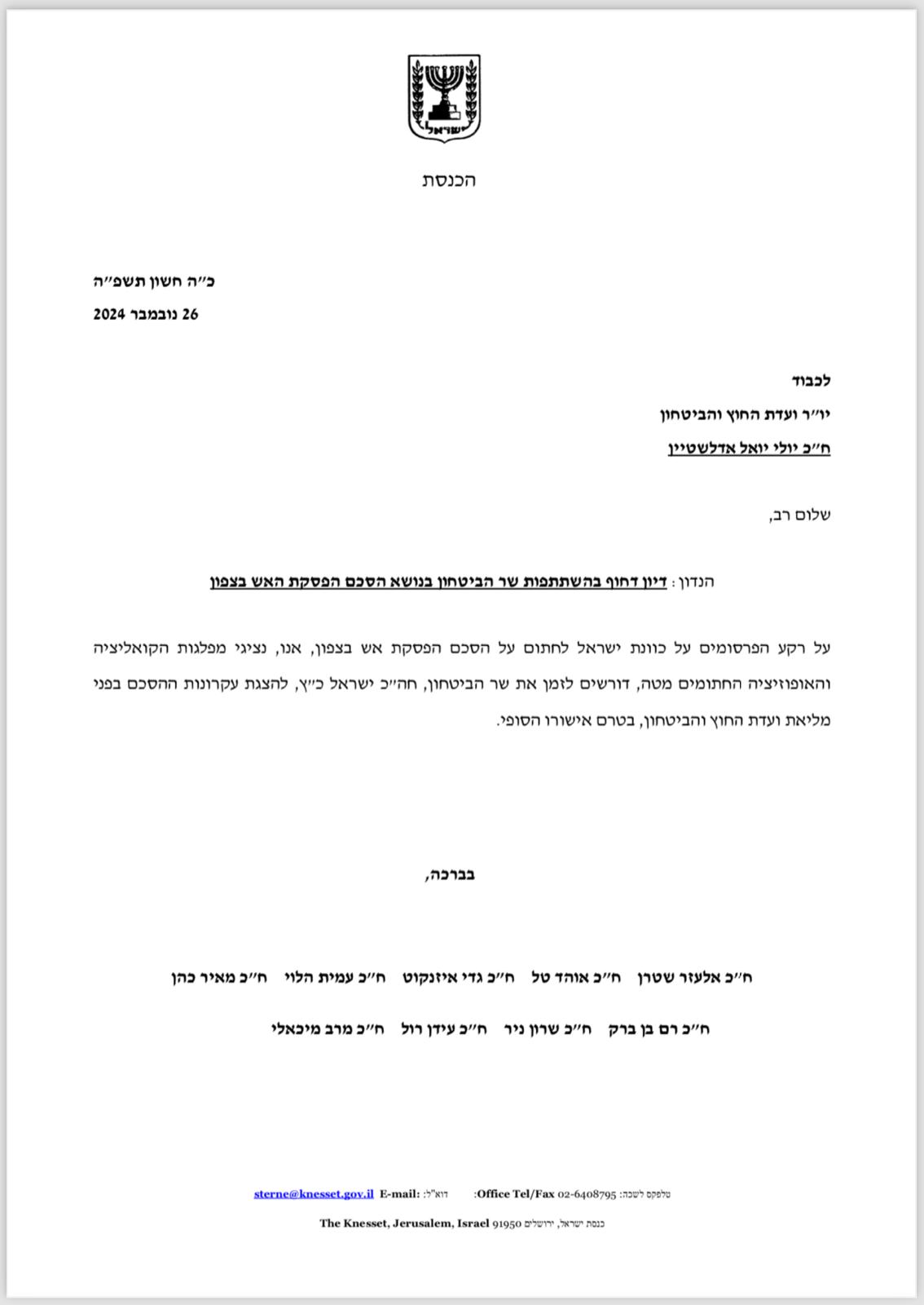 במכתב ששלחו לאדלשטיין נכתב: "על רקע הפרסומים על כוונת ישראל לחתום על הסכם הפסקת אש בצפון, אנו, נציגי מפלגות הקואליציה והאופוזיציה החתומים מטה, דורשים לזמן את שר הביטחון, חה״כ ישראל כ״ץ, להצגת עקרונות ההסכם בפני מליאת ועדת החוץ והביטחון, בטרם אישורו הסופי".