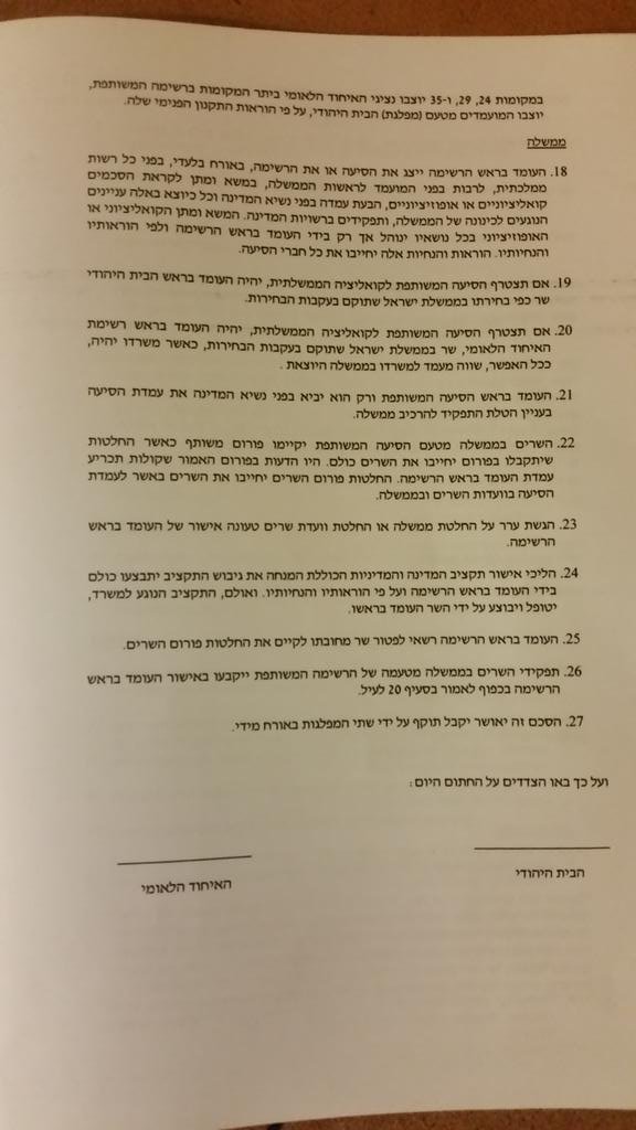ההסכם שמכיל 27 סעיפים מקנה למעשה שליטה מלאה לנפתלי בנט בסיעת הבית היהודי ומוציא מכלל אפשרות, כל יכולת תימרון פוליטית מצד האיחוד הלאומי-תקומה.