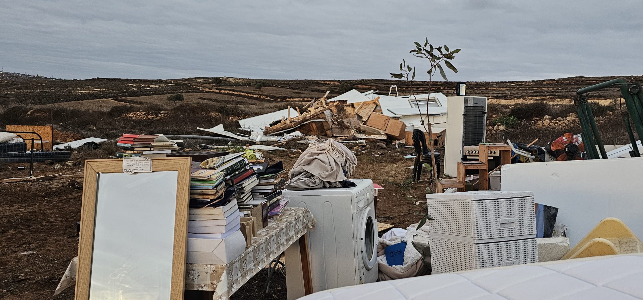 "התעוררנו מדפיקות עזות על הדלת ושוטרים שבישרו לנו שיש לנו 10 דקות לצאת מהבית ולהוציא את כל הריהוט והבגדים לפני שהבית ייהרס", סיפר אלישיב בן נתן. "ניסינו להסביר להם שאשתי בהיריון מתקדם וזה מעשה מטורף ולא אנושי לזרוק אותה ככה החוצה ב4 מעלות, אבל את השוטרים זה לא עניין. תוך 10 דקות כל הציוד – הרהיטים, האוכל הבגדים, הושלך החוצה בערימה והבית שלנו נהרס לחתיכות".