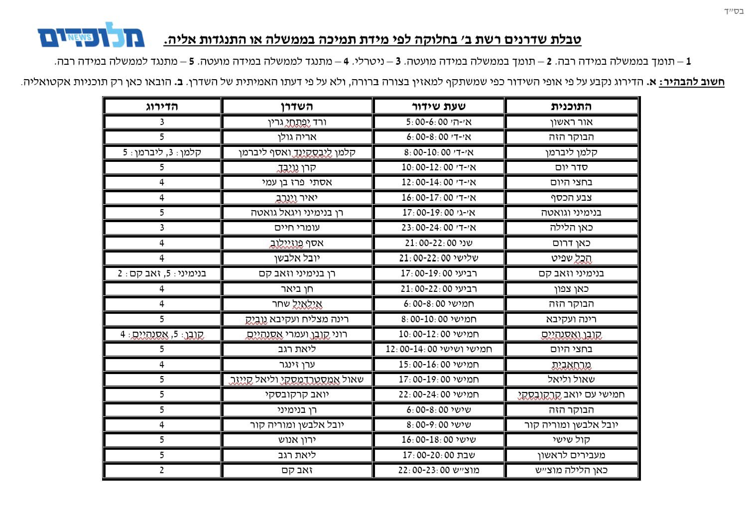 טבלה שיצרו גורמים המזוהים עם הליכוד, מטריפה את השמאל. בטבלה מקוטלגים שדרני התאגיד לפי תמיכתם בממשלה. 1 הוא ציון לתומך מאוד בממשלה ו-5 למתנגד מאוד לממשלה.