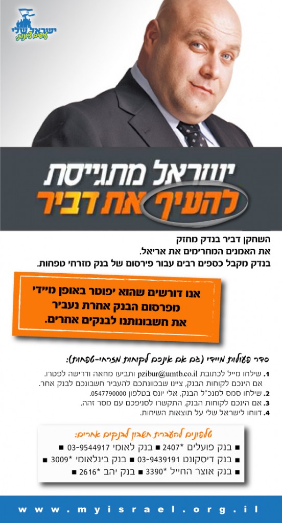 http://www.srugim.co.il/wp-content/uploads/2010/11/post-552×1024-עותק.jpg "ישראל שלי", יוצאת בקמפיין חדש נגד אמן נוסף שתומך באמנים שהודיעו כי לא יופיע מעבר לקו הירוק. השחקן דביר בנדק, שמגלם את דמותו בפרסומות של בנק מזרחי-טפחות, התבטא בסוף השבוע שעבר כי על שרת החינוך להתפטר בשל תמיכתה בהיכל התאטרון באריאל."