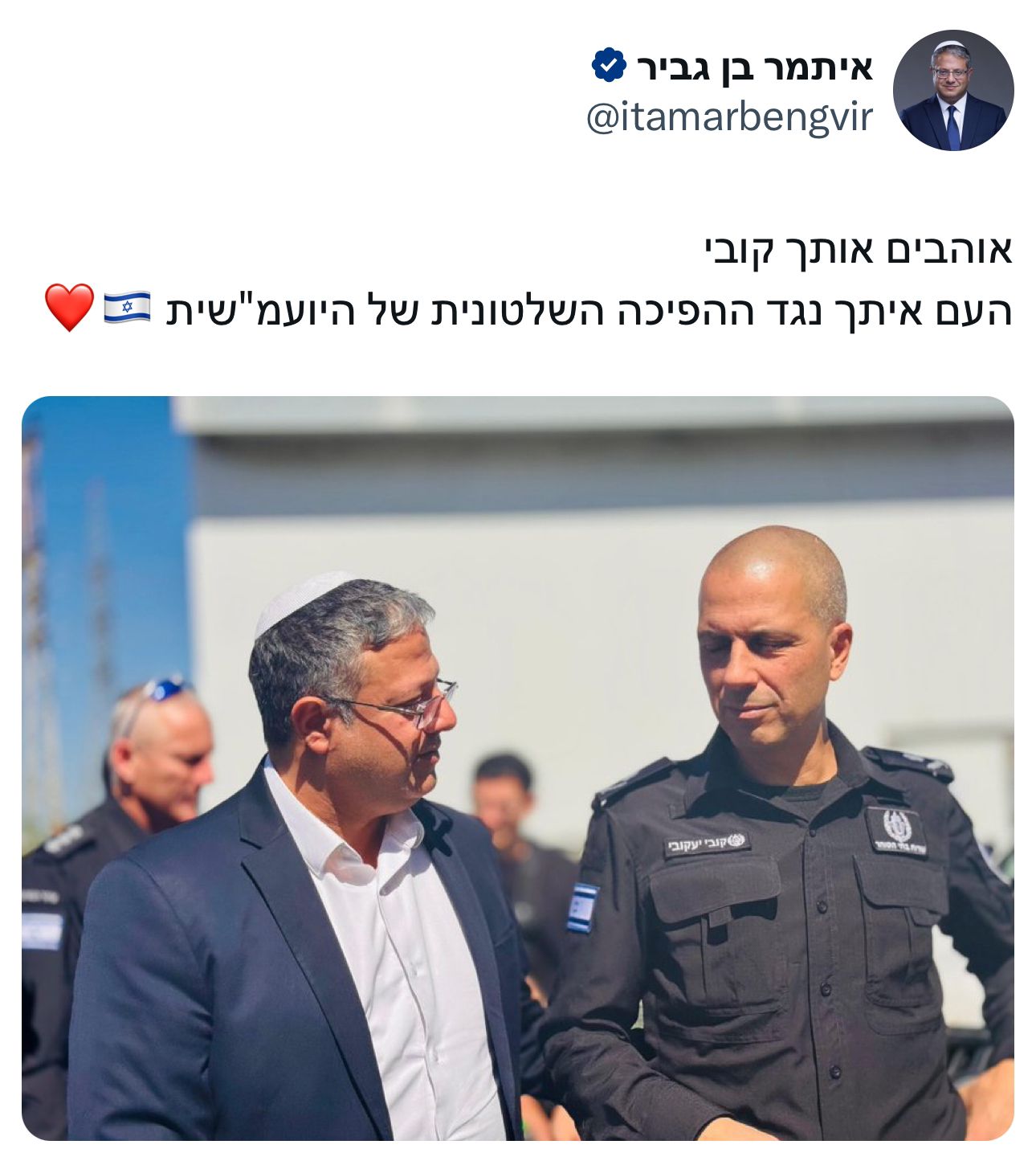"אני מודע לכך שהיועצת המשפטית לממשלה לא אהבה את השינויים והמדיניות שיישם", המשיך בן גביר. "אך במדינה דמוקרטית אין מקום ל’תפירת תיקים’ למי שדעותיו והמדיניות שהוא מבצע אינה לרוחה. אני נותן לו גיבוי מלא, והוא ימשיך להוביל את שירות בתי הסוהר ביד רמה".