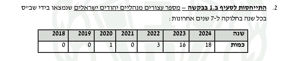 על פי הנתונים מספר העצורים המנהליים היהודים עמד על 0 בשנת 2021 ואילו בשנה החולפת זינק המספר ללא פחות מ-18 עצורים. גם בשנת 2023 היה מספר גבוה של עצורים מנהליים – 16.