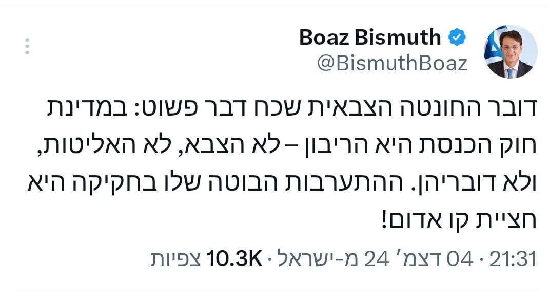 "דובר החונטה הצבאית שכח דבר פשוט: במדינת חוק הכנסת היא הריבון – לא הצבא, לא האליטות, ולא דובריהן" טען ביסמוט. "ההתערבות הבוטה שלו בחקיקה היא חציית קו אדום!".