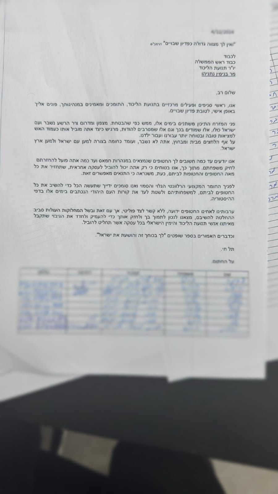 כותרת המכתב נפתחת בציטוט מהרמב"ם: "ואין לך מצווה גדולה כפדיון שבויים", והוא ממוען אל ראש הממשלה בפנייה ישירה: "אנו, ראשי הסניפים ופעילים מרכזיים בתנועת הליכוד, התומכים ומאמינים במנהיגותך, פונים אלייך באופן אישי, לטובת פדיון שבויים".