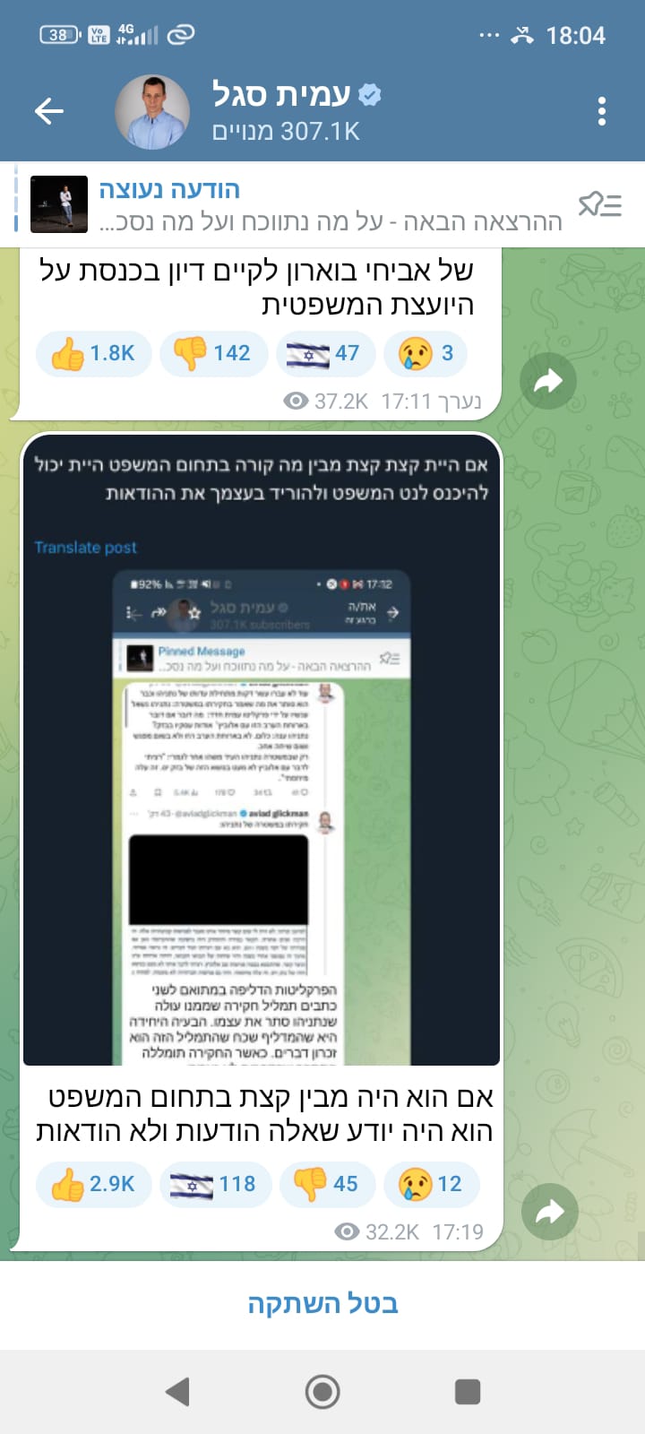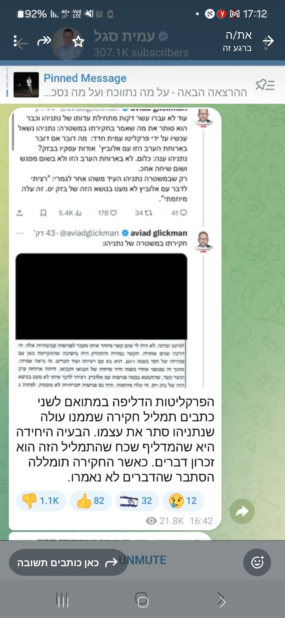הפרשן הפוליטי של חדשות 12, עמית סגל, פרסם בחשבון הטלגרם שלו את דבריו של עיתונאי חדשות 13, אביעד גליקמן וטען כי "הפרקליטות הדליפה במתואם לשני כתבים תמלול חקירה שממנו עולה שנתניהו סתר את עצמו". לאחר מכן הוסיף סגל: "הבעיה היחידה היא שהמדליף שכח שהתמליל הזה הוא זיכרון דברים. כאשר החקירה תומללה הסתבר שהדברים לא נאמרו".