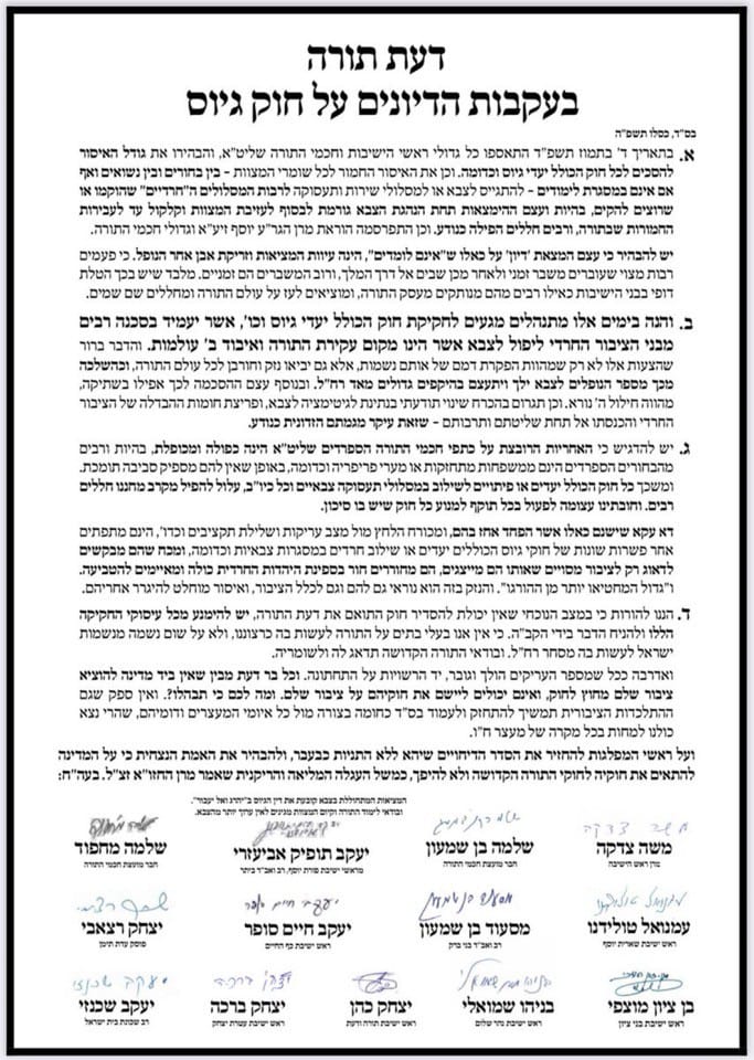 במכתב אותו פרסמו הערב, עליו חתומים בין היתר הרב משה צדקה, הרב שלמה מחפוד, הרב שלמה בן שמעון המשמשים כחברי מועצת התורה של ש"ס, יחד עם ראשי ישיבות ורבנים בכירים נוספים נכתב כי "יש להימנע מכל עיסוקי החקיקה" בנושא הגיוס.