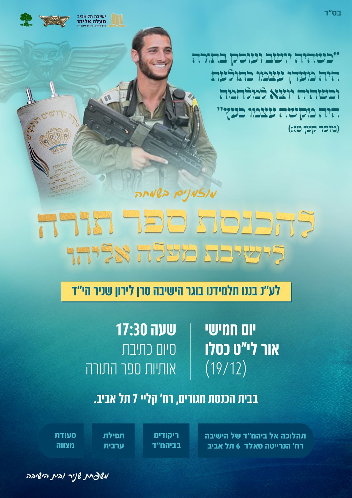 נשיא המדינה צפוי להשתתף הערב (חמישי) בשעה 19:30 בהכנסת ספר תורה בישיבת מעלה אליהו לזכרו של סרן לירון שניר ז"ל שנפל במלחמה. כזכור בתשעה באב בשנה שעברה הרצוג היה אמור להשתתף בקריאת מגילת איכה במקום וביטל בשל הצרכים הביטחוניים באותה העת.