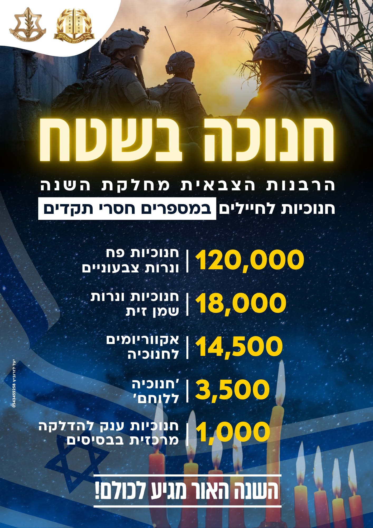 רגע לפני החנוכה, ובזמן שכוחות צה"ל פזורים בשלוש גזרות נרחבות, ברבנות הצבאית דאגו בשבועות האחרונים לכך שכלל חיילי צה"ל יוכלו להדליק נרות חנוכה, גם בלב שטחי הלחימה ומעבר לקווי האויב.