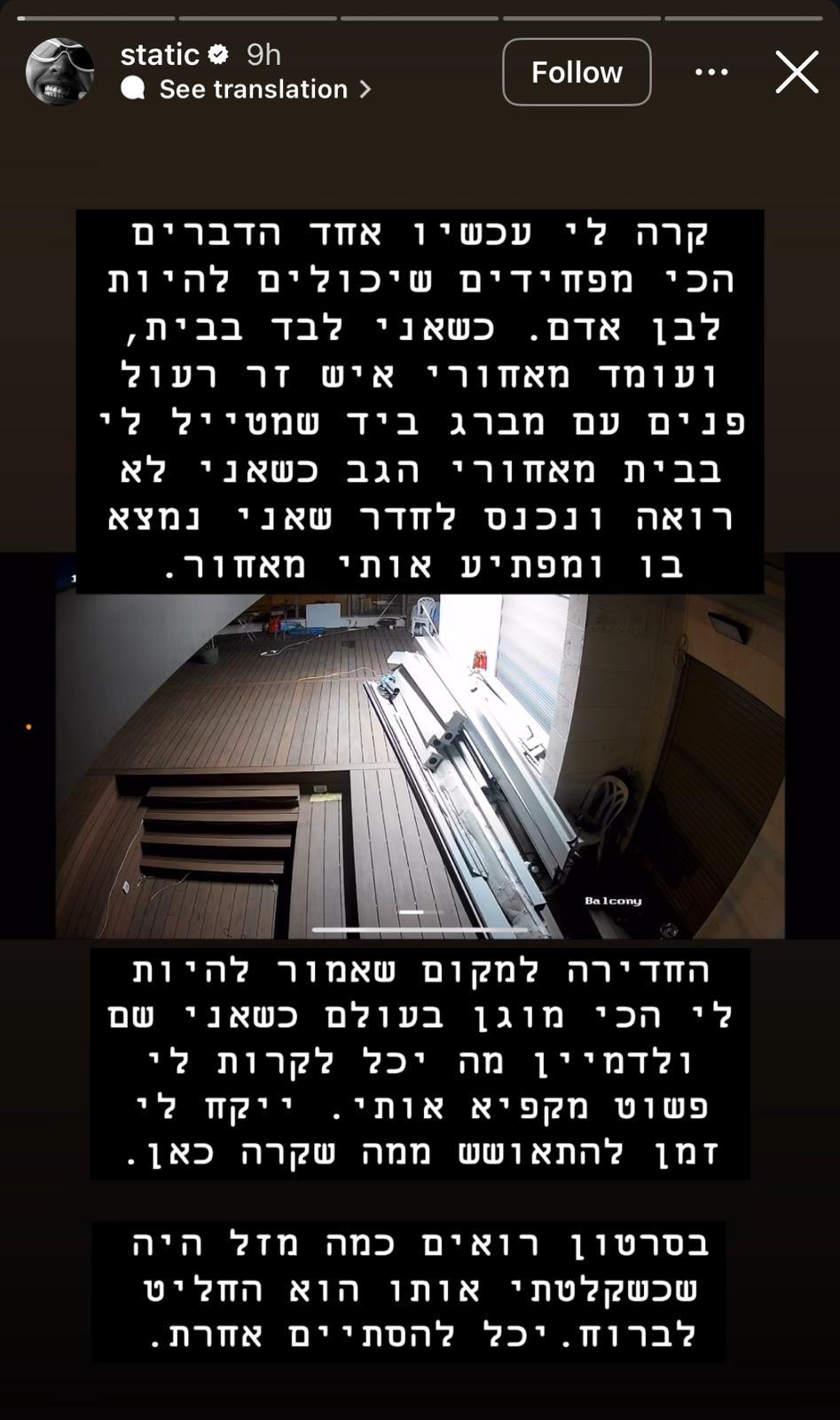 "קרה לי עכשיו אחד הדברים הכי מפחידים שיכולים להיות לבן אדם. כשאני לבד בבית, ועומד מאחורי איש זר רעול פנים עם מברג ביד, שמטייל לי בבית מאחורי הגב כשאני לא רואה ונכנס לחדר כשאני לא רואה, ונכנס לחדר שאני נמצא בו ומפתיע אותי מאחור", כתב סטטיק.