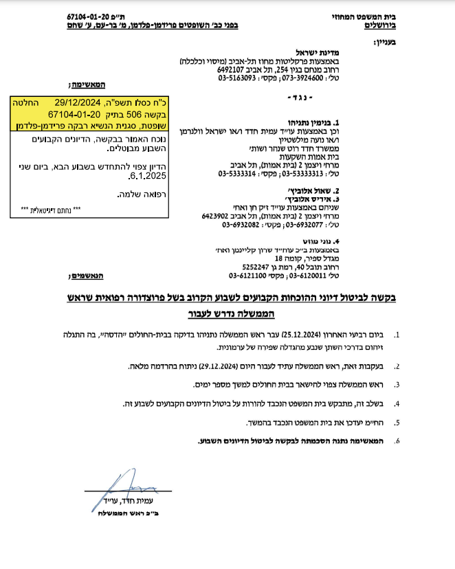 בעקבות הניתוח שראש הממשלה צפוי לעבור היום, שופטת בית המשפט המחוזי בתל אביב רבקה פלדמן – פרידמן אישרה את בקשתו של נתניהו לבטל את עדותו במהלך השבוע הקרוב. מוקדם יותר פנה רה"מ לפרקליטות והיא אישרה את בקשתו.