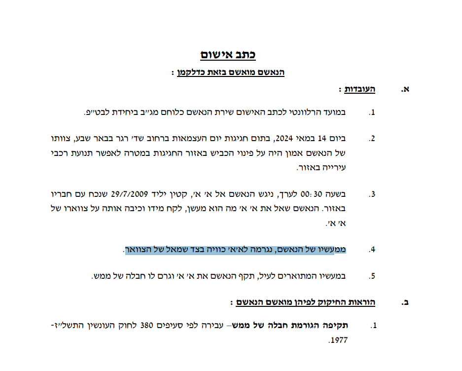 כתב האישום הוגש לבית משפט השלום בבאר שבע באמצעות עו"ד סיון שפייזר וצוות דרום במחלקה לחקירות שוטרים. כתב האישום מייחס ביצוע עבירה של תקיפה הגורמת חבלה של ממש.