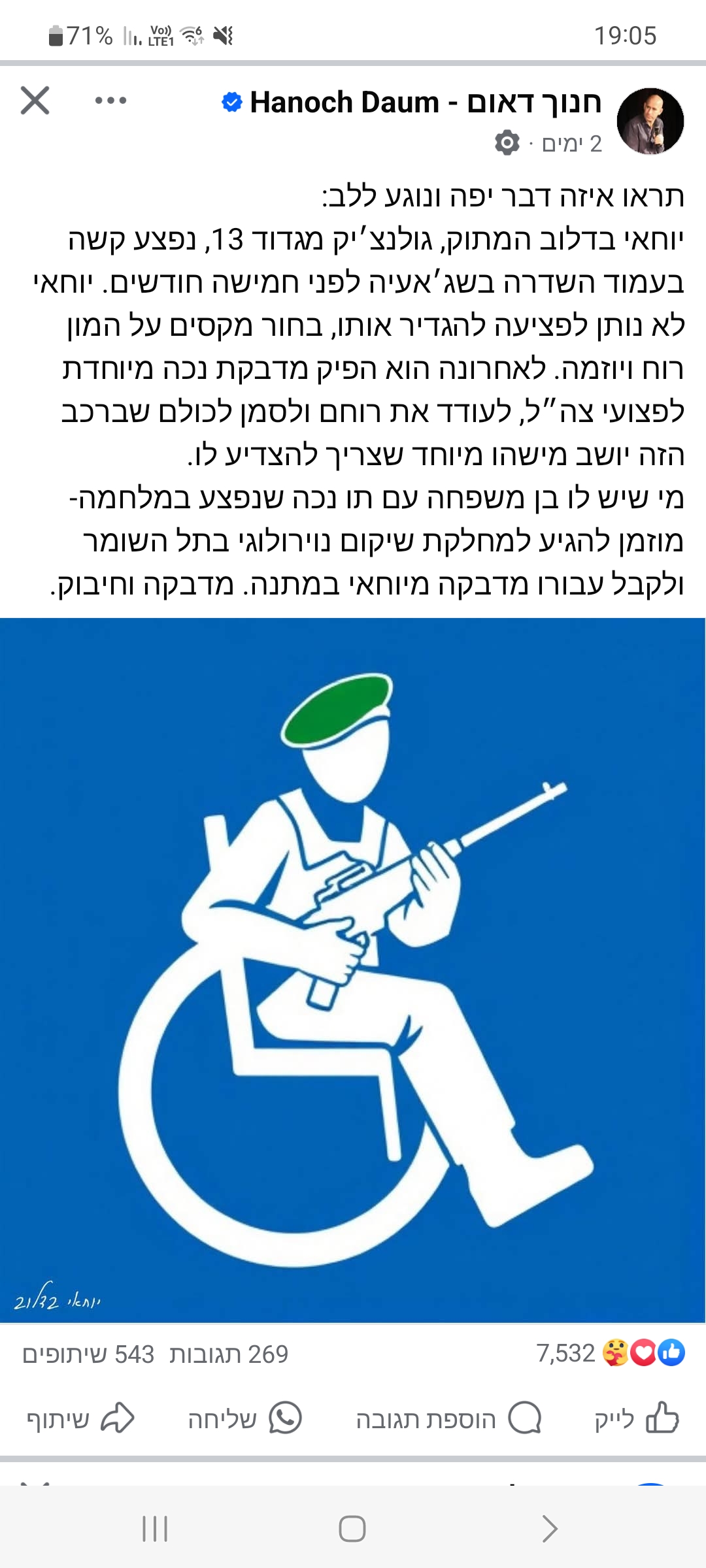 לפני כשבועיים הופץ ברשת פוסט שהפך לויראלי ושותף על ידי הקומיקאי חנוך דאום, על חייל מילואים בגולני, בשם יוחאי בדלוב, מגדוד 13, אשר נפצע קשה לפני כחמישה חודשים בלחימה בעזה, בחאן יונס, ומאז הוא משותק מהצוואר ומטה.
