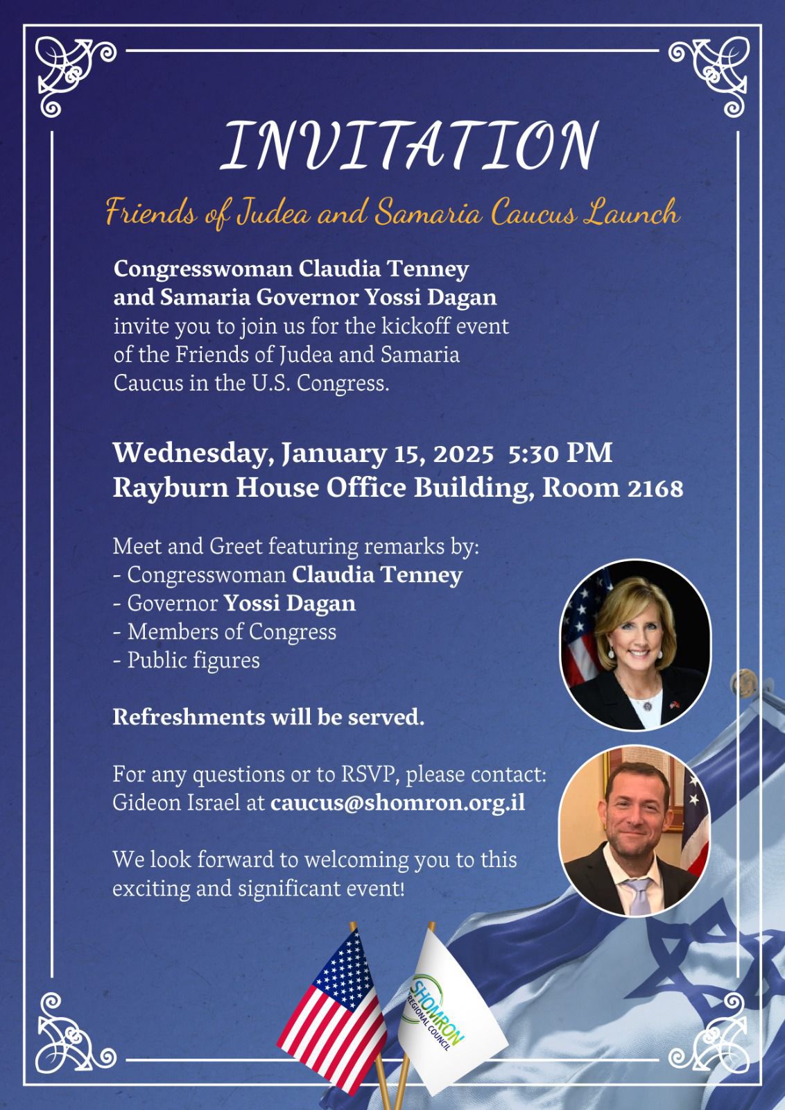 את השדולה יובילו חברת הקונגרס קלאודיה טני יחד עם חברי קןנגרס רבים, במשותף עם יוסי דגן ראש מועצת שומרון. השדולה צפויה להוות צעד משמעותי ראשון בחיזוק התמיכה הבינלאומית בהתיישבות אל מול הממשל החדש.