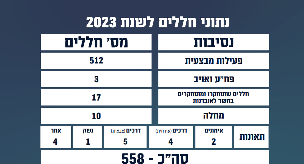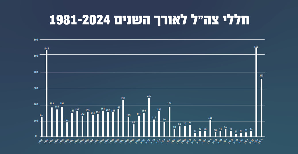 בשנת 2023 הכוללת את הטבח בשמחת תורה נפלו 558 חללים, 512 מהם בפעילות מבצעית שלושה בפיגועים והשאר בנסיבות אחרות. מדובר בשנתיים עם הכי הרבה נופלים מאז 1982, כמובן בגלל המלחמה המתמשכת.
