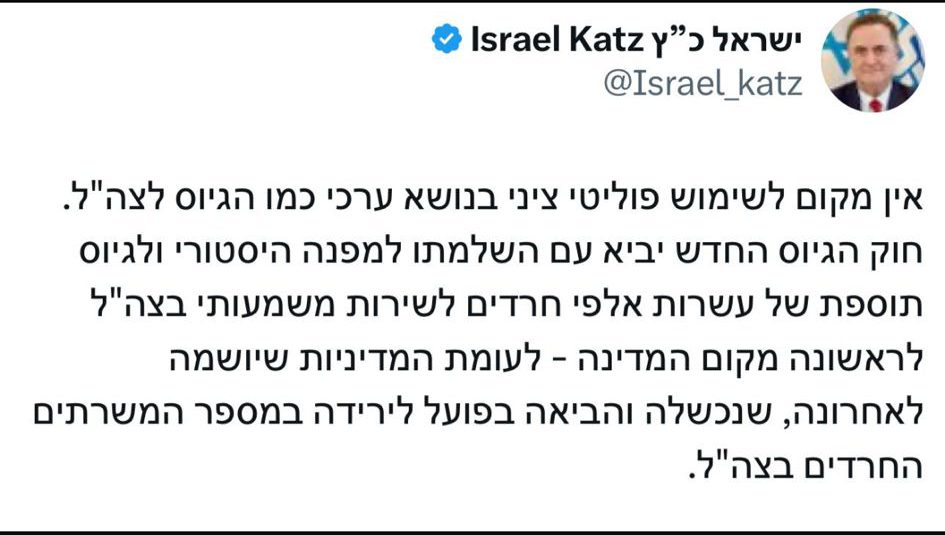 אחרי שגלנט יצא אמש נגד חוק הגיוס – שר הביטחון ישראל כ"ץ מגיב: "אין מקום לשימוש פוליטי ציני בנושא ערכי כמו חוק הגיוס".