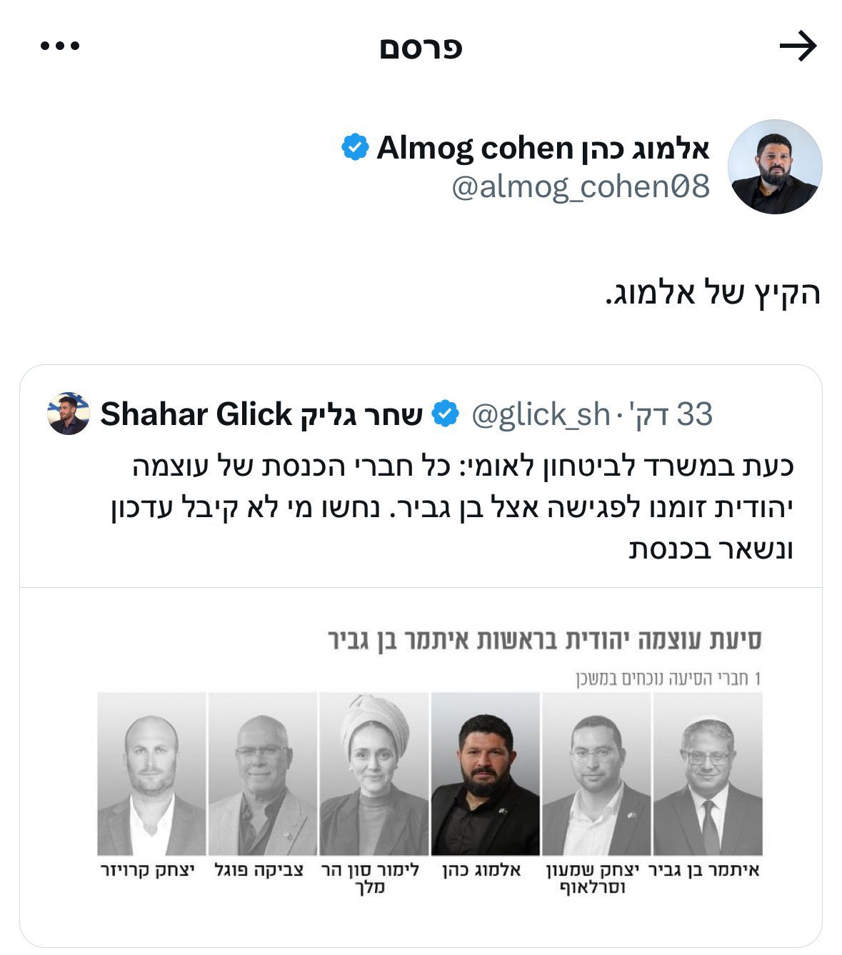 שבוע אחרי הדרמה במליאת הכנסת, במהלכה השר איתמר בן גביר וחברי מפלגת עוצמה יהודית – פרט לאלמוג כהן – הצביעו נגד עמדת הקואליציה וגרמו לראש הממשלה להגיע מבית החולים ולחבר הכנסת בועז ביסמוט לצאת מהשבעה על אימו, נראה שבן גביר החליט לנקום בכהן.