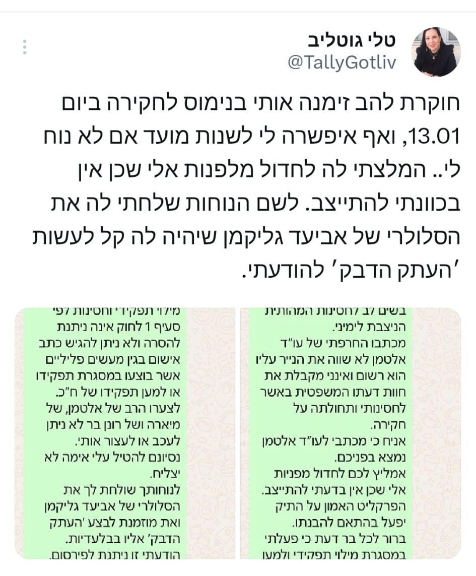 גוטליב המשיכה ותקפה: "לצערו הרב של אלטמן, של מיארה, ושל רונן בר לא ניתן לעכב או לעצור אותי. ניסיונכם להטיל עליי אימה לא יצליח". גוטליב סיימה בעקיצה לכתב המשפט של חדשות 13 וכתבה:  "לנוחיותכם, שולחת לך את הסלולרי של אביעד גליקמן ואת מוזמנת לבצע 'העתק הדבק' אליו בבלעדיות".