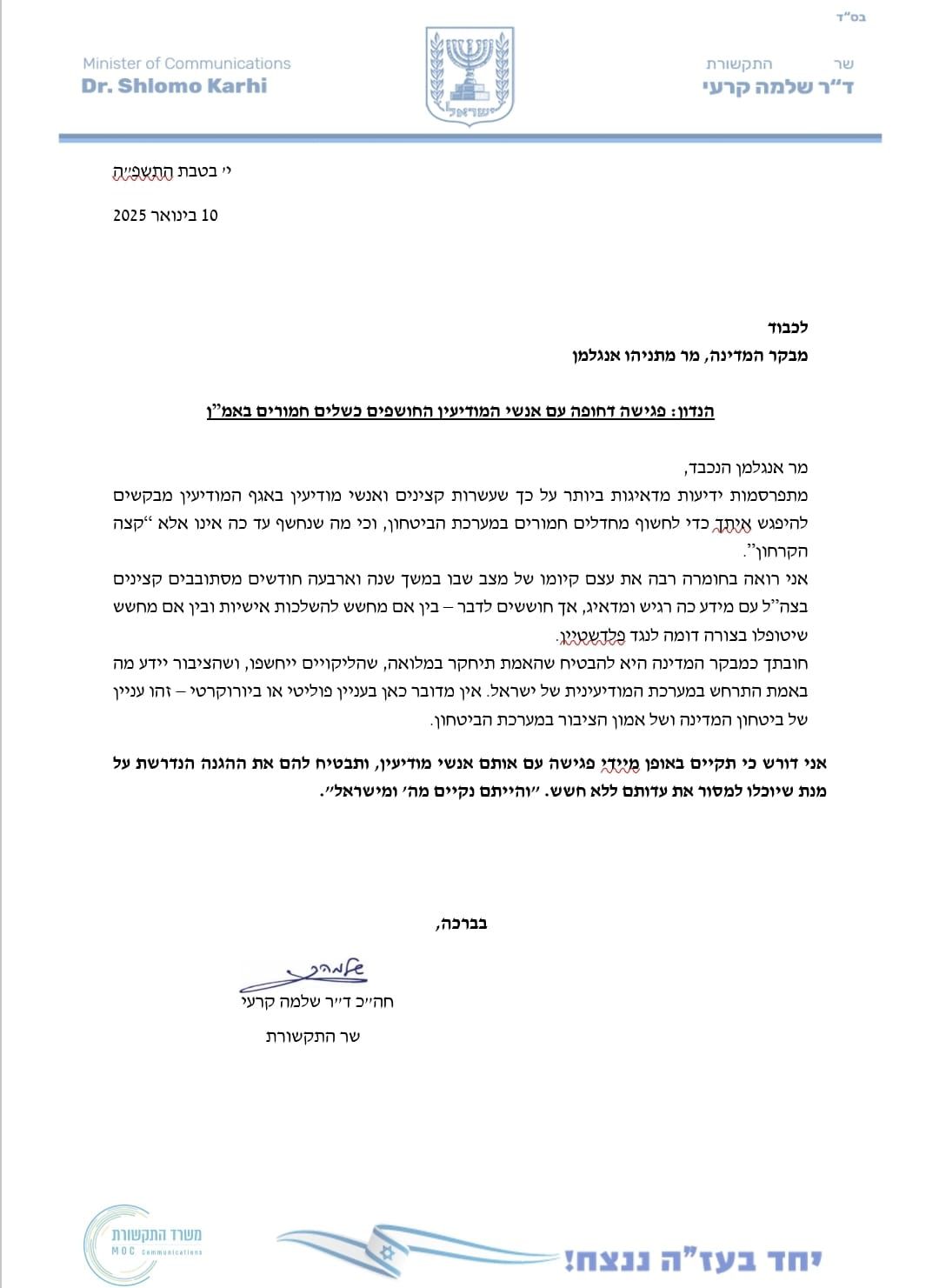 שר התקשורת ד״ר שלמה קרעי פנה היום (ו׳) במכתב רשמי למבקר המדינה, מר מתניהו אנגלמן, בדרישה לקיים פגישה דחופה עם קצינים ואנשי מודיעין המבקשים לחשוף מחדלים חמורים באגף המודיעין.