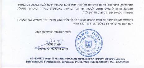 "אני פונה אליך בעניין שבנדון מפאת חשיבותו ונחיצותו הרבה. מדבריו של אלוף פיקוד העורף (בועדת חוץ ובטחון. צ"ש) השתמע כי לצה"ל אין מענה לבעייתם של יהודים מאמינים בעלי זקנים. אני רוצה להזכיר לך אדוני שר הביטחון, כי ישנם במדינה מאות אלפי יהודים הרואים בשמירה על זקנם מצווה גדולה ובעלת ערך יהודי משמעותי בחייהם ובאמונתם." כותב הרב הראשי.