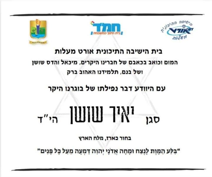 עיריית מעלות- תרשיחא הודיעה על נפילתו של בן העיר סגן יאיר שושן מחטיבת הנח"ל בקרב בצפון רצועת עזה.